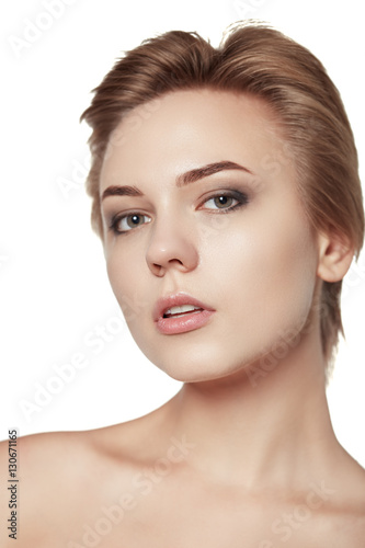 close up portrait beauty short hair makeup isolated white