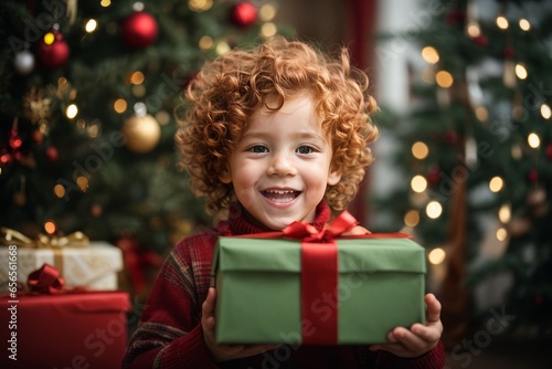 Close up portrait of a beautiful little smiling boy with curly and red hair on the background of a Christmas tree