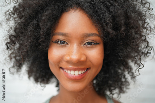 Close up portrait of a cheerful afro girl smile with happiness in the morning.