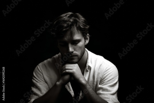 portrait, man, thoughtful, expression, serious, sad, pensive, male, caucasian, 1, black, white, closeup, sharpened, light, shadow, detail, emotion, face, human, seriousness, style, photo, artistic