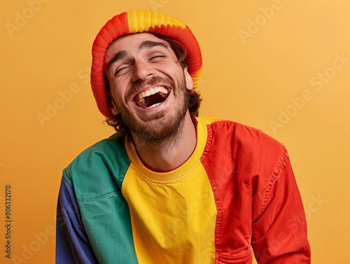 illustration, ai, man, photogenic, brunette, smile, laugh, smiling, laughing, caucasian, brown, colourful, colours, orange, yellow, portrait, closeup, closeup, teeth, studio, model, face, hair, fashion, expression, person, people, funny, lip, fun, red, looking, mouth, 1, happiness, emotion, joy, head, white, clothes, glamour, beard, guy, man, casual attire, blond, blond