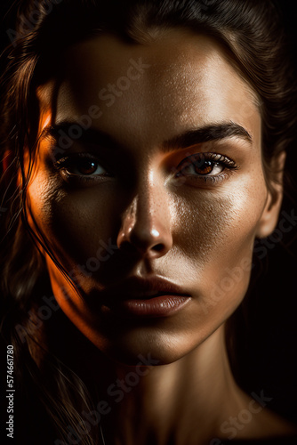 Close up portrait of a woman, light streaming on her face while she poses in the darkness - AI generative
