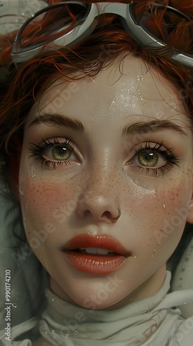 green eye, art, mood, eye, dreamlike, stunning, gorgeous, reflective, mesmerizing, photo, thoughtful, nose ring, sensual, creative, red hair, mouth, beautiful, woman, beauty, contemporary, intense, feeling, fashion, realistic, impressionistic, dreamy, emotion, surreal, painting, human, avant-garde, face, portrait, goggles, fine art, illustration, lip, digital artwork, artistic, phantasmagoric, enchanting, hypnotic, closeup, captivating, freckle, female, wet, model, style