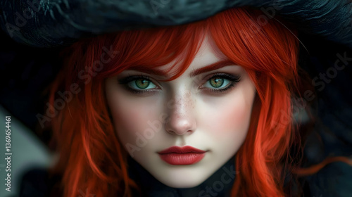 woman, red hair, green eye, freckle, portrait, closeup, face, fiery, intriguing, mysterious, fantasy, gothic, dark, red lips, make-up, fashion, beauty, model, attractive, beautiful, head shot, female, girl, expression, serious, intense, haunting, captivating, alluring, seductive, enigmatic, stylish, elegant, glamourous, redhead, vibrant, passionate, powerful, photo, dark background