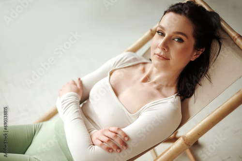Close up portrait of beautiful brunette woman in a white top and leggings sitting at the chair and looking to the camera. Sporty girl relaxing after workout