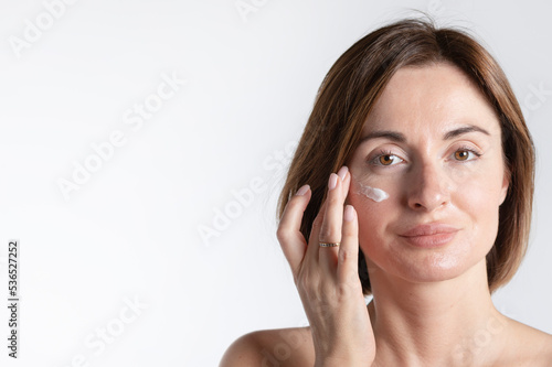 Close up portrait of beautiful woman applying cream on her face isolated on white background. Skin care and beauty concept