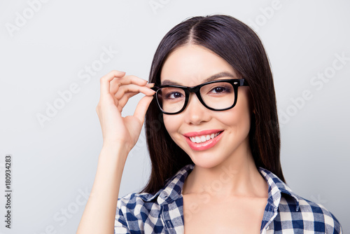 Close up portrait of charming smart lady with toothy smile, hazel eyes and beautiful face is touching her spectacles, dressed in casual checkered clothes isolated on grey background