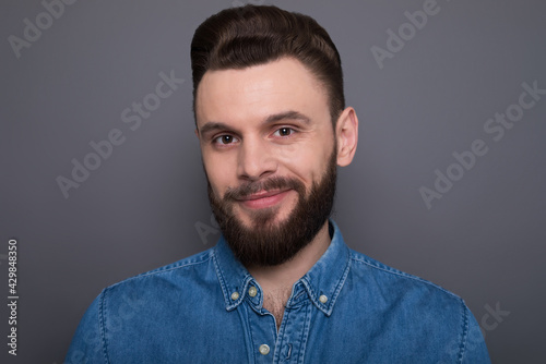Close up portrait of confident serious bearded modern man while he looks on the camera