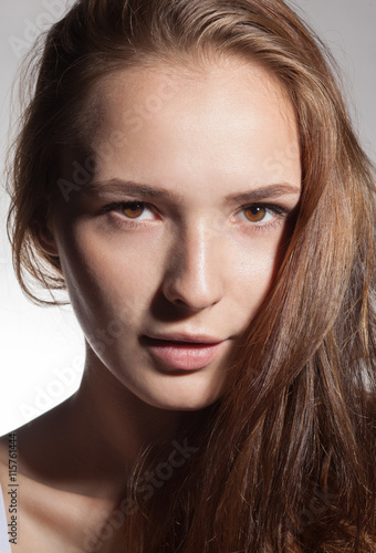 close up portrait of female model beautiful caucasian brunette woman, natural beauty
