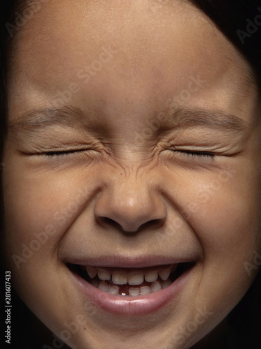 Close up portrait of little and emotional asian girl. Highly detail photoshot of female model with well-kept skin and bright facial expression. Concept of human emotions. Crazy happy.