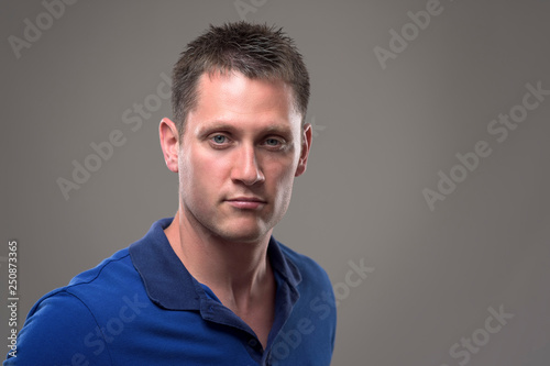 confident, man, portrait, intense, face, male, attention, expression, staring, cool, watching, person, head shot, studio, grey background, atmospheric, moody, shadow, blue, green eye, blue eye, guy, handsome man, real people, people, attractive, photogenic, athletic, fit, muscular, young adult, 30s, manly, macho, closeup, caucasian, copy space, analysing, dramatic, success, individuality, effort, judging, sceptical, suspicious, unconvinced, uncertain