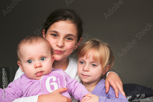 Close up Portrait of Three Beautiful Sisters, One Cute Toddler Girl , 6 Month Old Baby Girl, 7 Years Old Girl, Best Friends Forever, Happy family concept, The most Beautiful Girls, Princesses