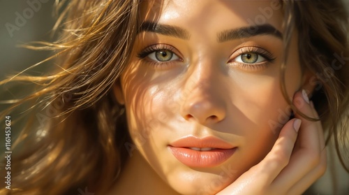 Close up portrait of young woman with sun kissed skin and flowing brown hair expression is serene and confident natural beauty