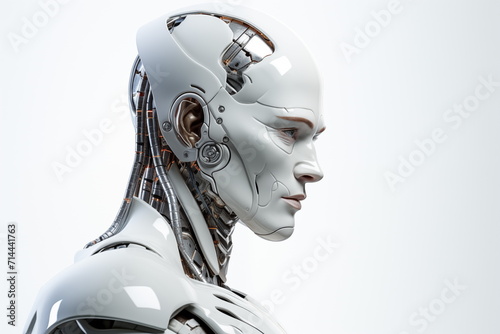Close up portrait white humanoid robot on the futuristic white background. Artificial Intelligence. Quantum computer. Generated AI