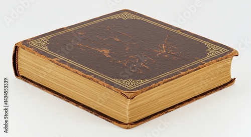 Close up shot of an old, square book with a brown cover and gold trim on a white background surface