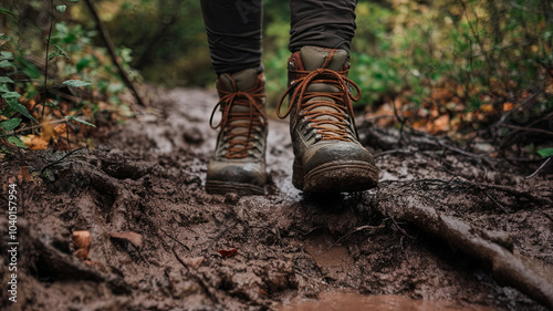 close up shot of hikers boots trudging through muddy terrain, showcasing ruggedness and determination of outdoor exploration. boots are caked in mud, emphasizing adventurous spirit of hiking