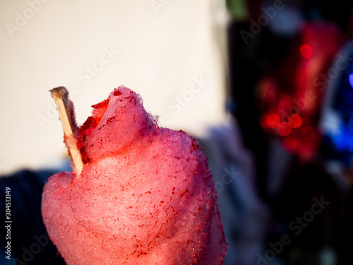 Close up shot of red candyfloss on a wooden stick on a blurry background with bokeh effect. Half-consumed candyfloss on a stick. Details of small sugar bubbles on a red candyfloss at local fair.