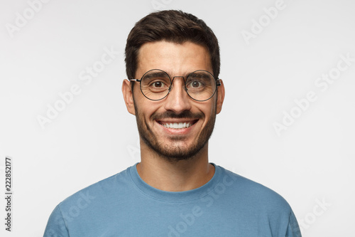 Close up shot of smiling attractive man in blue t-shirt and trendy round eyeglasses isolated on gray background