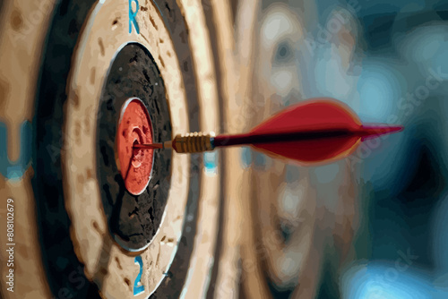 Close up shot of the dart arrow hit on bullseyes of dartboard to represent that the business reached the target of company with dark tone picture style