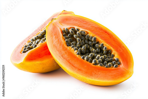 Close up shot ripe papaya with seed isolated on white background, Tropical juicy fruit concept.