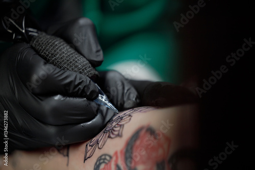Close up tattoo master professional tattoo artist in black gloves making a rose tattoo on a man's forearm. He is holding a tattoo machine.