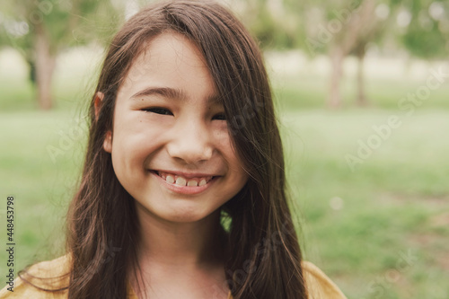 Close up urban lifestyle portrait of a confident, charming and gorgeous mixed race child face, happy multicultural Asian girl in park