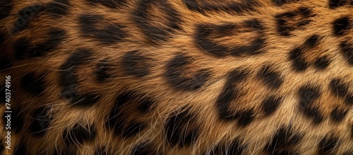 Close up view of a Felidaes fur showcasing its black spots, a natural pattern on its fur. The terrestrial animals snout and sleek fur blend seamlessly