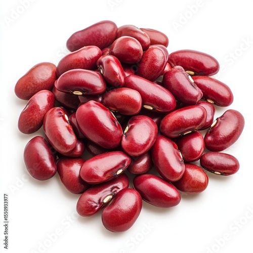 Close up view of a pile of kidney beans against a plain white background. The beans are deep red and shiny, exhibiting a healthy appearance.