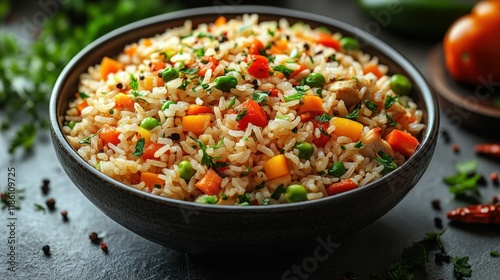 Close Up View of Colorful Bowl of Delicious Fried Rice with Fresh Vegetables and Herbs Ready to Serve on Rustic Background