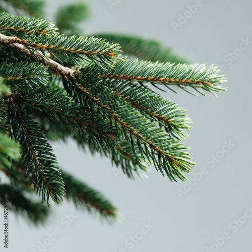 Close up view of evergreen tree branch with vibrant green needles and natural texture