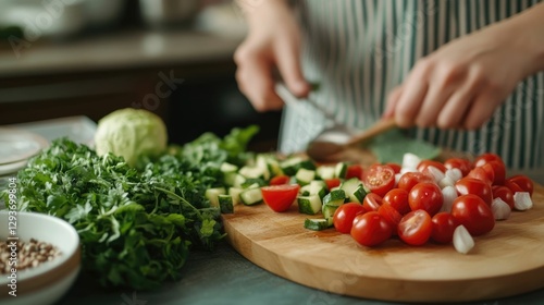 kitchen, cooking, healthy, ingredient, meal, vegetable, food, fresh, tomatoes, salad, lettuce, hand, table, countertop, produce, organic, chopping, slicing, cutting, culinary, receipe, cookery, homemade, lifestyle, nourishment, dietary, wellness, well-being, natural, environmentally friendly, sustainable, domestic, family, household, indoor, home, gastronomy, healthy eating, diet, vegetable, fruit, wooden board, culinary arts, home cooking