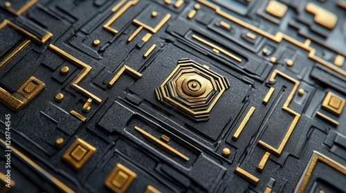 circuit board, technology, electronic, gold, black, pattern, detailed, closeup, three-dimensional, abstract, modern, geometric, line, square, rectangle, complex, intricate, design, texture, graphic, industrial, chips, microchip, computer, datum, information, digital, innovation, future, engineering, hardware, circuitry, metal, gold, patterned, dark, illuminated, illustration, graphic design