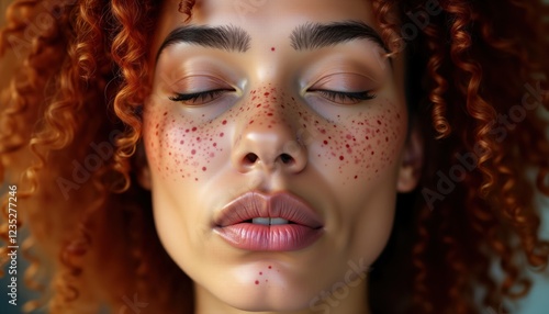 woman, mixed race, freckle, eyes closed, curly hair, red hair, beauty, diversity, natural beauty, generative, ai, face, close, skin, model, portrait, people, photo, image, posing, artistic, creative, digital, art, fashion, product, body, positivity, individuality, serene, thoughtful, mobile, phone, girl, teenage, senior, closeup, photogenic, expression, natural, look, bang, feminine, graceful, hope, mixed, race, woman, with, generated