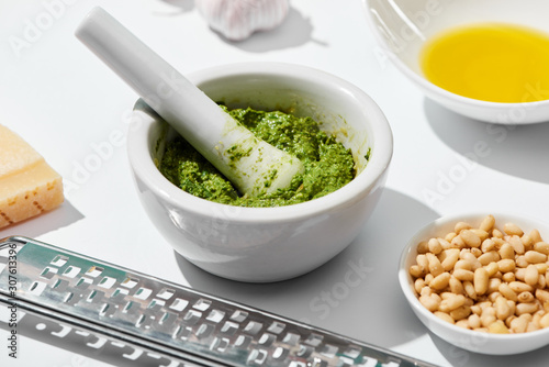 close up view of pesto sauce in pounder near grater, ingredients on white background