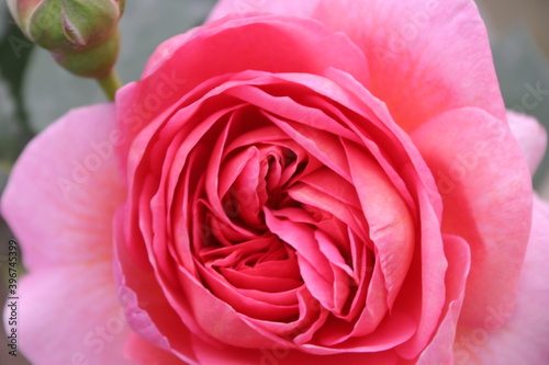 Close up view of pink rose in a garden with blurred background