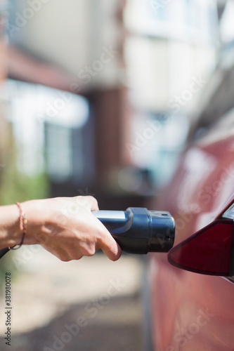 closeup, woman, female, recharge, electric, car, adult, mature, caucasian, obscured, hold, lifestyle, environmentalism, sustainable, refuel, alternative, fuel, battery, charge, plug, hybrid, power, sunny, hand, outdoors, day, people, 1, alone, unrecognizable, transportation