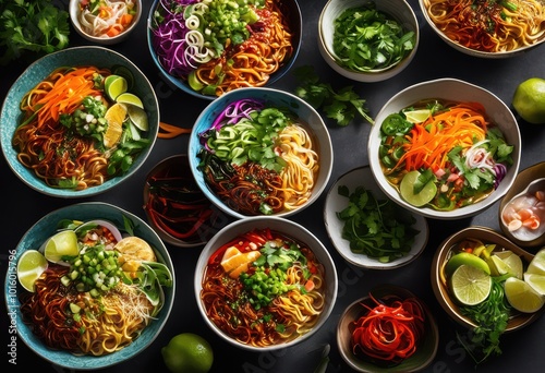 close vibrant colorful noodle dishes bowls showcasing diverse ingredients textures, noodles, vegetable, spices, herbs, sauce, asian, meal, entree, parsley