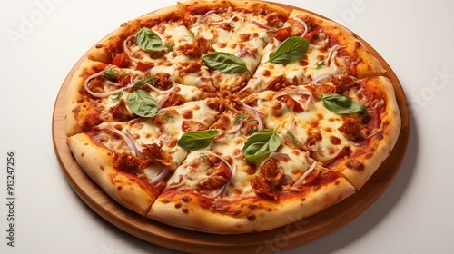 Close view of a pizza, front view from above, studio lighting, isolated white background.