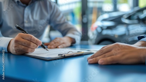 Close-up a car salesman and a customer were sitting at a table in a car showroom. explain signing a contract for the purchase to buy a brand-new luxury car and insurance.