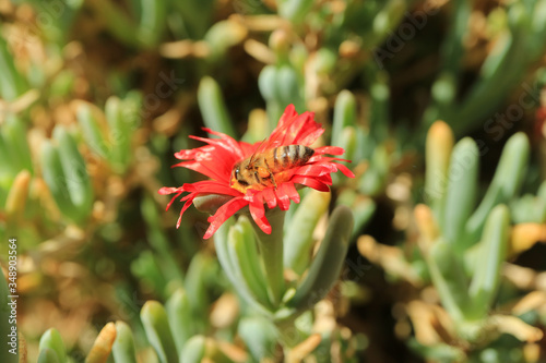 Closeup a little bee collecting nectar on bright red blooming Lampranthus flower
