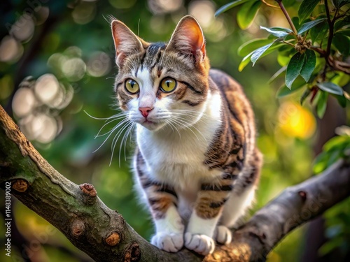 Close-up: A white spotted cat, poised on a branch, eyes a curious, unsuspecting prey.