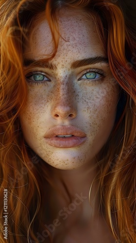 Close-up beauty portrait of a young redhead woman with natural freckles and striking green eyes in warm sunset lighting, perfect for beauty, cosmetic, and lifestyle advertising.