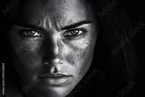 woman, face, portrait, black, white, monochrome, eye, intense, gaze, stare, freckle, skin, texture, lip, mouth, expression, emotion, dark, shadow, light, contrast, detail, beauty, model, art, photo, graphic, digital, illustration, artistic, moody, mysterious, serious, confident, powerful, fierce, strong, determination, sharpened