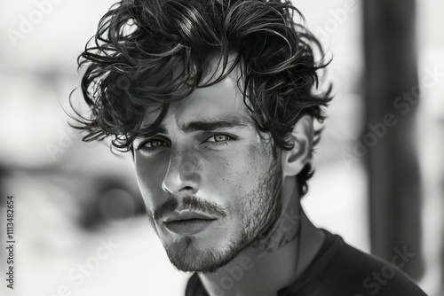 haircut, style, barbershop, guy, portrait, black, white, young, man, curly, hair, intense, gaze, thoughtful, closeup, monochrome, photogenic, model, introspection, expression, stylish, depth, male, photo, texture, contrast, facial, serene, serious, contemplative, dramatic, charming, background, artistic, soft, lighting, greyscale, fashion, adult, captivating, natural, profile, mood, fine, art, image, expressionist, soulful