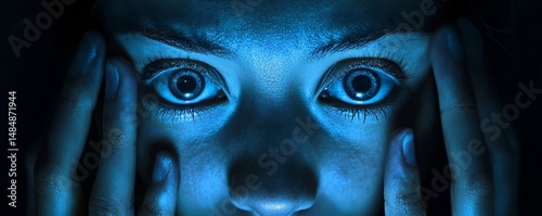 woman, eye, face, hand, fear, dramatic, portrait, closeup, blue, lit, dark, moody, light, skin, girl, hope, sad, intense, expression, emotion, mystery, shadow, texture, person, human, anxiety, stress, vulnerable, desperate