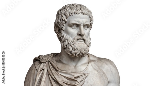 statue, bust, marble, ancient, roman, greek, history, classical, sculpture, detail, head, portrait, face, beard, hair, drapery, clothing, stone, art, culture, figure, powerful, dignified, serious, thoughtful, wisdom, closeup, pale, light, smooth, realistic, classic, white, background, isolated, upper, body, man, male, strong