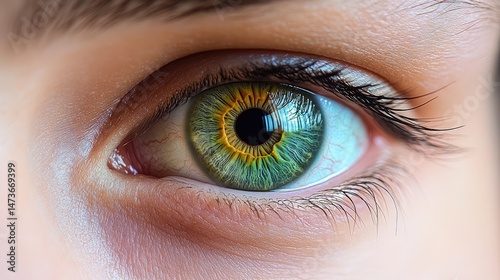 Close-up captures the vibrant and intricate detail of a captivating green eye with yellow hues, framed by delicate