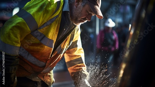 Close-up capturing street cleaner's dedication in hosing down city sidewalk