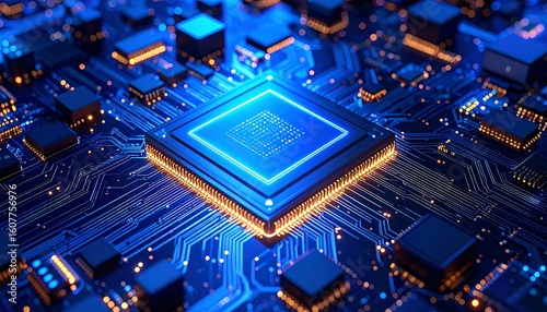 central processing unit, circuit, board, technology, electronic, digital, glowing, blue, light, processor, microchip, computer, hardware, integrated, circuitry, innovation, future, modern, detail, graphic, three-dimensional, rendering, realistic, square, metal, gold, line, trace, pattern, complex, system, datum, processing, power, performance, speed, intelligence, computing, advancement, engineering, design, tech, electrical, component, high technology