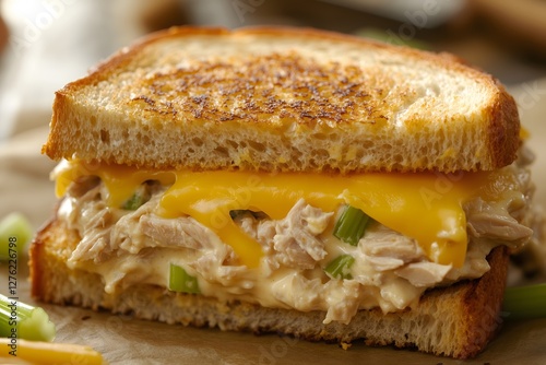 Close-up cross section view of a delicious tuna melt sandwich